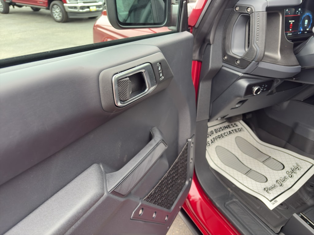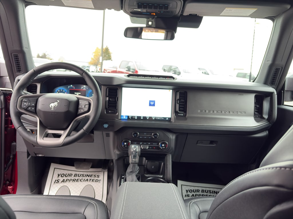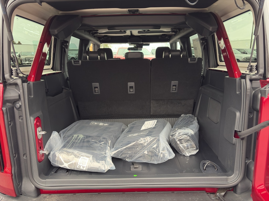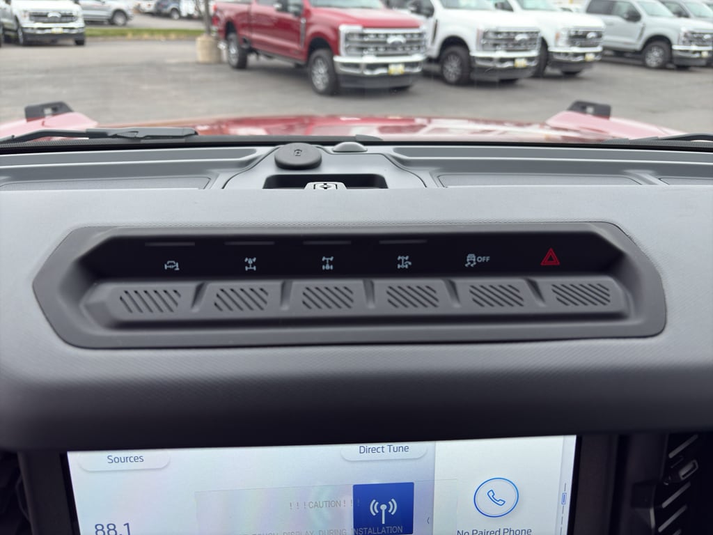 Equipment Group 332A Mid Package: Rear Parking Sensors; Power Outlet - Back Side of Center Floor Console; Dual Smart Charging USB Ports; Front Row Heated Seats; Driver and Front Passenger Illuminated Sliding Visor Vanity Mirrors; AM/FM Stereo; Marine Grade Vinyl Heated Bucket Seats; Dual-Zone Electronic Automatic Temperature Control; Connected Navigation; Ambient Footwell Lighting; Remote Start System; 2-Door Intelligent Access with Lock/unlock. Ford Co-Pilot360: Auto High-Beam Headlamps; Rear View Camera; Pre-Collision Assist with Automatic Emergency Braking; Blind Spot Information System (BLIS); Lane-Keeping System. Sasquatch Package: High Clearance Fender Flares; High Clearance Suspension; 4.7 Final Drive Ratio; LT315/70R17 Rugged-Terrain Tires; Position-Sensitive Bilstein Shock Absorbers. Shadow Black Painted Hard Top. 17 Black High Gloss-Painted Aluminum Wheels. Ford Performance Heavy-Duty Modular Front Bumper. Hard Top Sound Deadening Headliner. Ruby Red Met Tinted CC. Door Storage Bags. Front and Rear Floor Liners Without Carpet Floor Mats. **Equipment listed is based on original vehicle build and subject to change. Please confirm the accuracy of the included equipment by calling the dealer prior to purchase.**